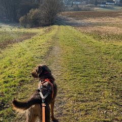 Aktivitäten: Kiba liebt körperliche und geistige Auslastung. Er geht zum Beispiel begeistert Mantrailen oder hobbymäßig Laufen im Zuggeschirr. Er hat viel Power und Freude an solchen Aufgaben.