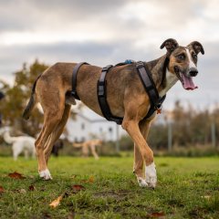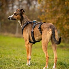 Der Windhundmischling befindet nun schon seit einigen Wochen auf seiner Pflegestelle in Deutschland und zeigt nach wie vor keine einzige negative Eigenschaft. Taro ist ein Traumhund! Der 62cm hohe und trotzdem nur 26 Kilo leichte Rüde ist sehr verschmust, ruhig und vorsichtig, herzzerreissend einfühlsam, gelehrig und hochintelligent, äußerst geduldig, verträglich mit Allem und Jedem und ist auch noch bildhübsch. Taro sucht stets die Nähe zu seinen Menschen, ist ein großartiger Spaziergänger, der gern bei Fuß läuft (manchmal auch etwas zu nah) und er ist hundertprozentig stubenrein. Am liebsten macht er es sich mit seinen Menschen auf der Couch bequem, wenn er darf. Dann wird der schlaksige Rüde zum kleinen Schoßhündchen und genießt jede Streicheleinheit, die er bei Unterlassung auch einfordert. ;-)Taro lernt sehr schnell. Zum Beispiel, dass er nicht aufs Bett darf, aber auf das Sofa schon. Das "Sitz" und "Bleib" vor dem gefüllten Napf hat er sofort verinnerlicht. Sogar auf reine Handzeichen reagiert er bereits. Auch dass es für ihn nichts bei Tisch gibt, hat er schnell kapiert. Er macht zwar zunächst seine Hundeblick-Runde um den gedeckten Tisch und nutzt seine stattliche Körpergröße gern für einen neidischen Blick auf alle Teller, zieht sich dann aber auch bald in sein Körbchen zurück, weil er die Zwecklosigkeit des Bettelns einsieht. Das Kommando "Nein !" ruft ihn zuverlässig von jeder Versuchung ab, bspw. auch draußen, wenn er etwas Essbares gefunden haben sollte. Mit Artgenossen verträgt er sich problemlos, gibt auch den Lauten und Aufdringlicheren keinerlei Anlass zur Eskalation, und auf dem Hundefreilaufplatz zeigt er eindrucksvoll, wieviel Windhund in ihm steckt. Katzen begegnet er mit Neugier und ohne jegliche Aggression. Es ist anzunehmen, dass er auch sein Zuhause mit Katzen teilen würde. Kleinkindern gegenüber ist er neugierig und lässt sich problemlos auch von ungeschickteren Händen anfassen. Entsprechend einfach ist auch das Ankleiden mit Geschirr und Jäckchen: er lässt alles klaglos über sich ergehen. Bellen hört man ihn äußerst selten. Er weint jedoch, wenn er alleingelassen oder vom Familiengeschehen ausgeschlossen wird. Die Verlustängste sind offenbar da. Noch ungewohnt und daher mit Stress verbunden sind für ihn Autofahrten und Spaziergänge durch eine belebte Innenstadt. Beim Autofahren kann es ihm manchmal schlecht werden und auf der Fußgängerzone ist ihm der laute Trubel unheimlich und er steuert geschütztere Bereiche wie Hauseingänge etc. an. In beiden Fällen wird sein Verhalten aber sukzessive besser, da er auch hier lernfähig ist und Ängste nach und nach verliert. Taro freut sich über jede Gassirunde, es muss aber entgegen seiner Natur nicht immer ein Marathon sein. Auf den ihm bekannten Routen trottet er bei lockerer und durchhängender Leine neben seinem Menschen her. In unbekanntem Territorium schaltet er auf Erkundungsmodus und nutzt seinen Leinenspielraum gern aus. Fallen erste Regentropfen, zeigt er eindrucksvoll, wie gut seine Ortskenntnis ist: dann zieht er Herrchen oder Frauchen an der Leine auf direktem Wege nach Hause, denn Regen mag er gar nicht. Taro ist ganz klar einer der wunderbarsten Hunde, die seine derzeitige Pflegestelle bislang beherbergen durfte. Wir hoffen sehr, dass der hochintelligente und empathische Taro in eine Familie vermittelt wird, in der er sich geistig und körperlich gut ausleben kann und nicht allein sein muss. Gerne hilft er auch im Büro und begeistert dort durch seine genügsame, ruhige und unauffällige Anwesenheit.